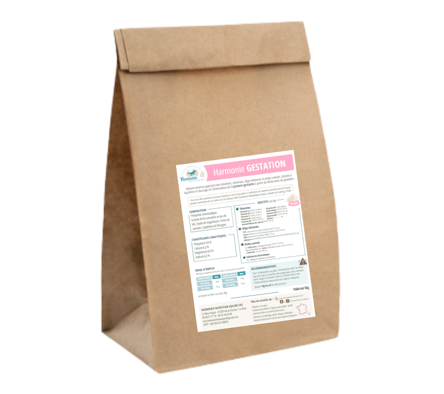 Durant la gestation, les besoins en calcium et en phosphore de la jument augmentent à partir du 8ème mois afin de permettre un bon développement squelettique du foetus. Une grande partie des fourrages sont suffisants pour couvrir les besoins en calcium mais pas en phosphore. De plus, le développement du système ostéoarticulaire et des tissus conjonctifs du fœtus nécessitent un apport important en cuivre et en zinc. Le CMV Harmonie Gestation est donc à distribuer aux juments gestantes à partir du 8ème mois de gestation pour permettre le développement optimal du fœtus tout en couvrant les besoins de la mère.